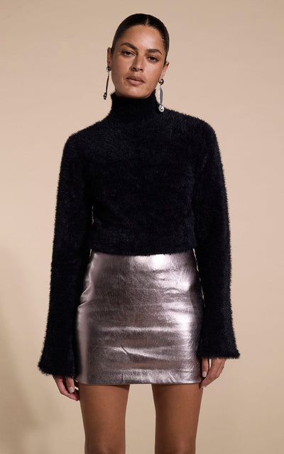A female model is facing forward. She wears a Dancing Leopard peach , high neck jumper with fluted sleeves. The model pairs it with a soft pink mini skirt.