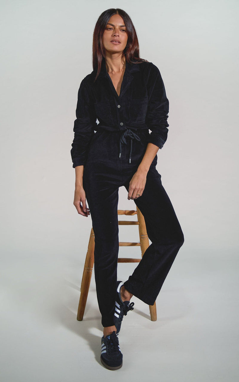 Katsumi Jumpsuit In Black Katsumi Jumpsuit In Black Female model sitting down on a couch. She wears a Dancing Leopard black velour jumpsuit. Katsumi Jumpsuit In Black